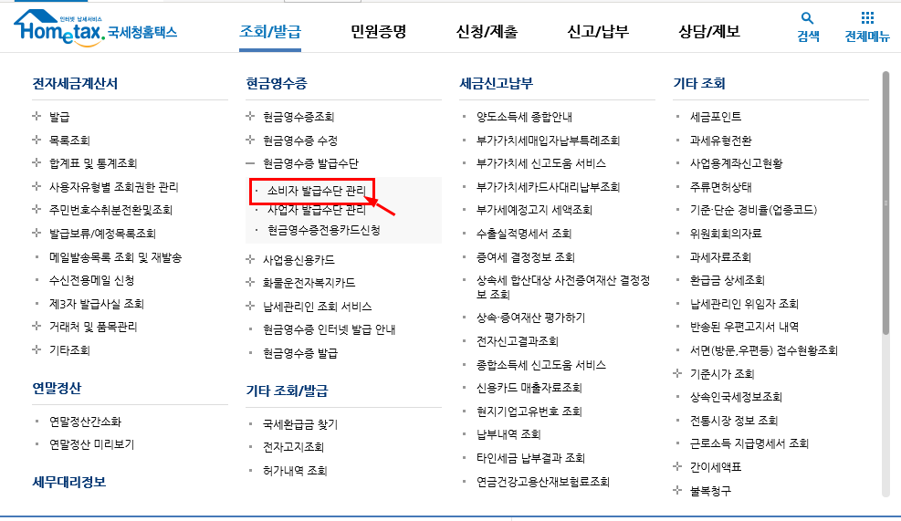 1. 홈택스 홈페이지 : 로그인> 조회/발급> 현금영수증> 현금영수증 발급수단